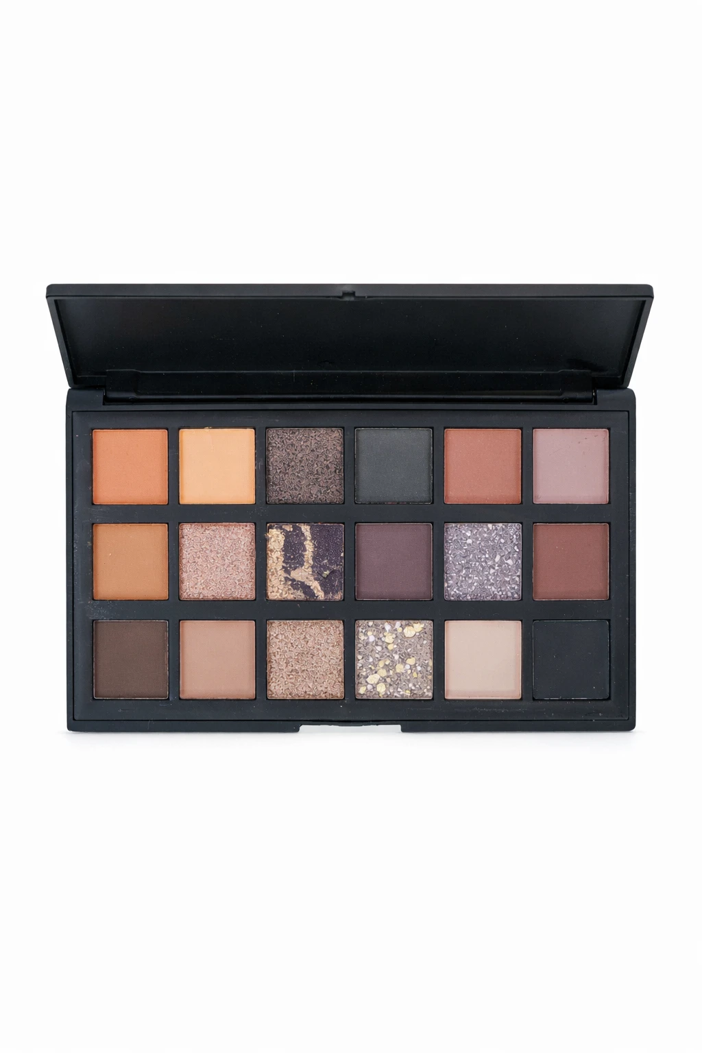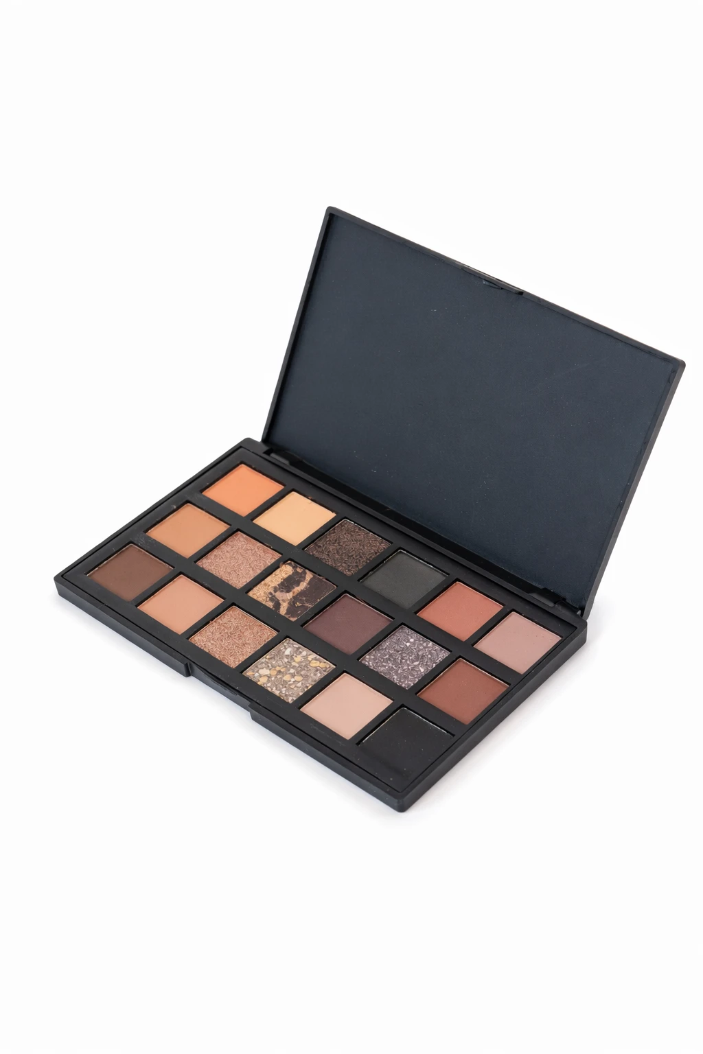 Paleta de sombras para ojos que combina tonos neutros, profundos y metalizados,